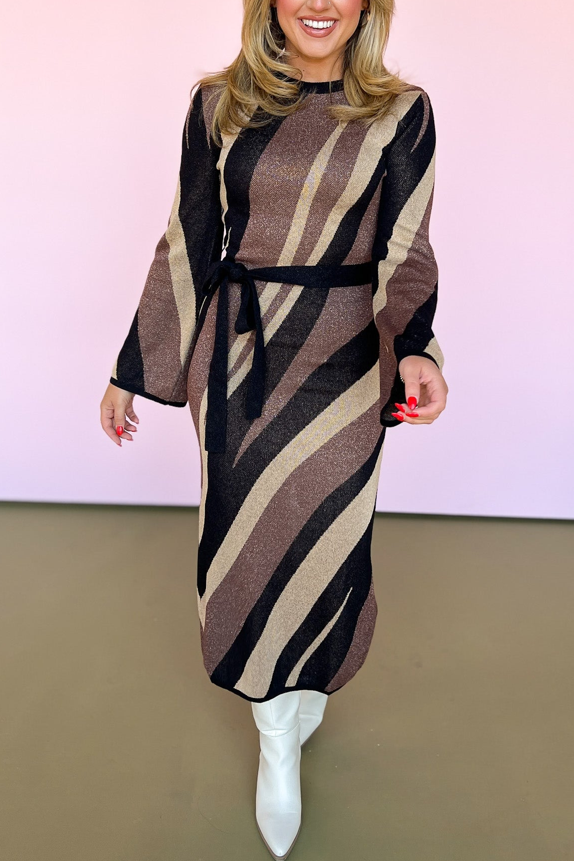 Black Multi Metallic Jacquard Self Tie Long SleeveMidi Dress