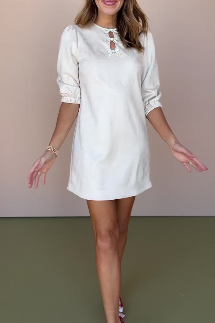 We're glad you've clicked on our new Ecru Faux Suede Rhinestone Bow Detail Dress as we're really into its casual vibes! The Dress cut make this a great choice for any stylish girl.